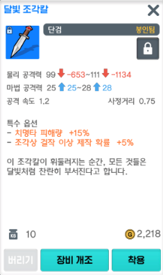 여우평원 이비테가 드랍하는 달빛 조각칼입니다. 걸작 이상 제작 확률을 5% 추가시켜 줍니다. 요즘 패치로 보스젠이 많이 빨라져서 꽤 얻을만합니다. 그걸핟고 100% 드랍을 하진 않습니다. 필자의경우는 여우 대작을 위해서 여우 심장석을 노리면서 이비테 주변으로 자사를 돌려두었고 자고일어나니 득을 해둔상태였습니다. 어떤 조각상이던 빠르게 대작을 띄우는게 답입니다. 그리고 조각은 본격적으로 할때는 적어도 9~10렙은 되야 이때부터 걸작이상이 잘나온다고 생각합니다.