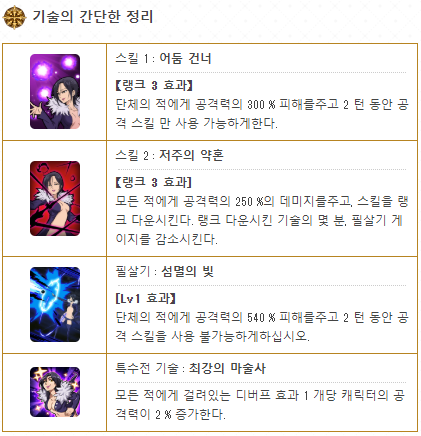 멀린의 장점은 스킬을 통해서 상대가 공격 스킬만 사용이 가능하게 만드는점과 스킬랭크 다운 및 필살기 게이지 감소를 시킨다는점입니다. 또한 필살기를 통해 2턴간 공격 봉쇄시키는것도 크게 작용을 하죠. 커뮤니티에서는 성기사 고서와 함께 사용하면 좋다고 나와있네요. 고서를 요즘은 주로 보지는 못하는것 같지만..