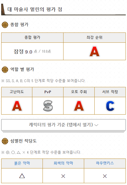 먼저 인피니티 멀린의 평점은 9.0으로 꽤 높은편에 속하며 특히 pvp에서 S등급을 받습니다. S정도의 등급을 받으면 일곱개의대죄 결장에서 현역으로 빈번하게 사용해도 된다라고 개인적으로는 생각합니다. 그외에도 오토주회 고난이도에서도 사용이 가능합니다.