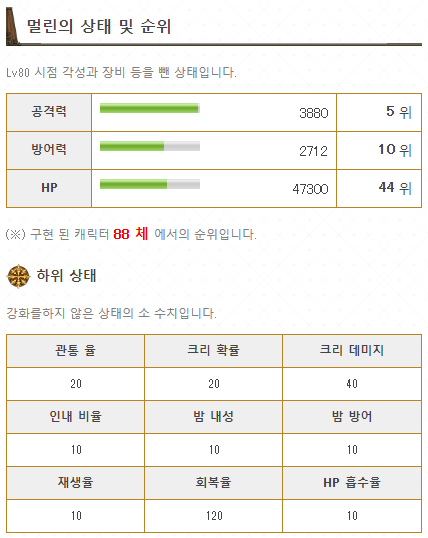 인피니티 멀린의 상태와 추가능력치 입니다. 공격력의 5위로 상당히 높은편에 속하며 방어력또한 준수하지만 hp가 많이 떨어지는 편입니다. 크리데미지가 40이 붙어있고 hp흡수율도 있음.