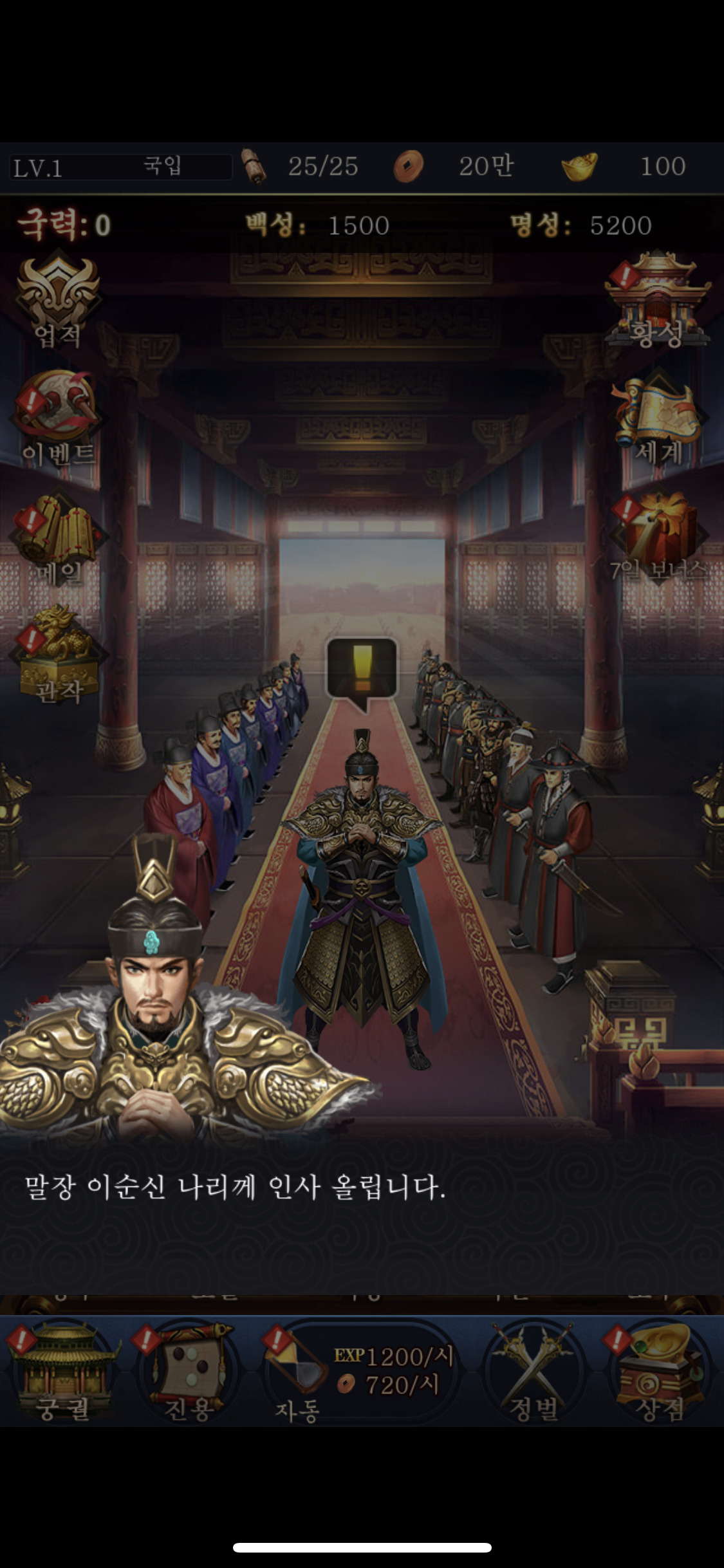 초반에 장수는 이순신이 주어집니다. 그리고 힐러로 사용이 가능한 의녀 장금을 추가적으로 받을 수있음. 조금 게임이 여러 컨텐츠가 들어가있는 느낌입니다. 방치를 하면 자동으로 시간마다 경험치와 골드를 얻을 수 있습니다. 더욱 높은 스테이지를 깨면, 당연히 방치시 더 높은 보상이 들어오겠죠.