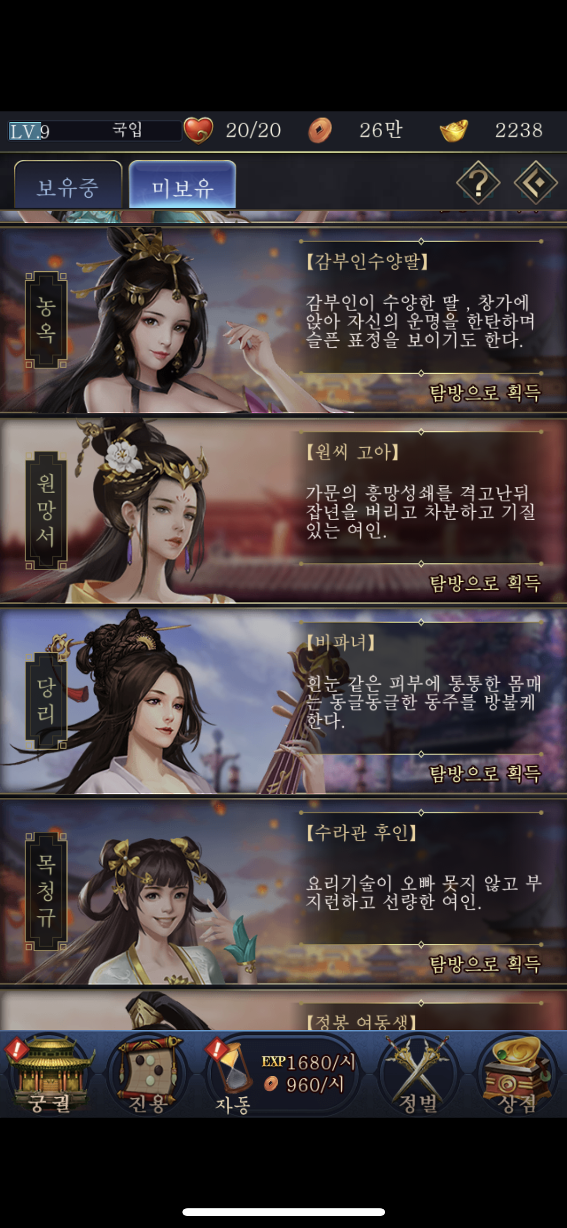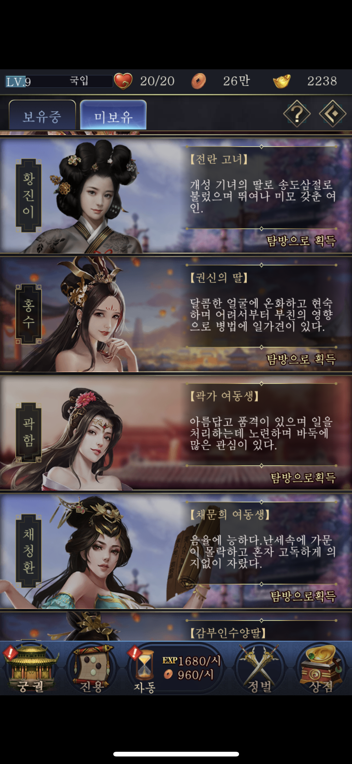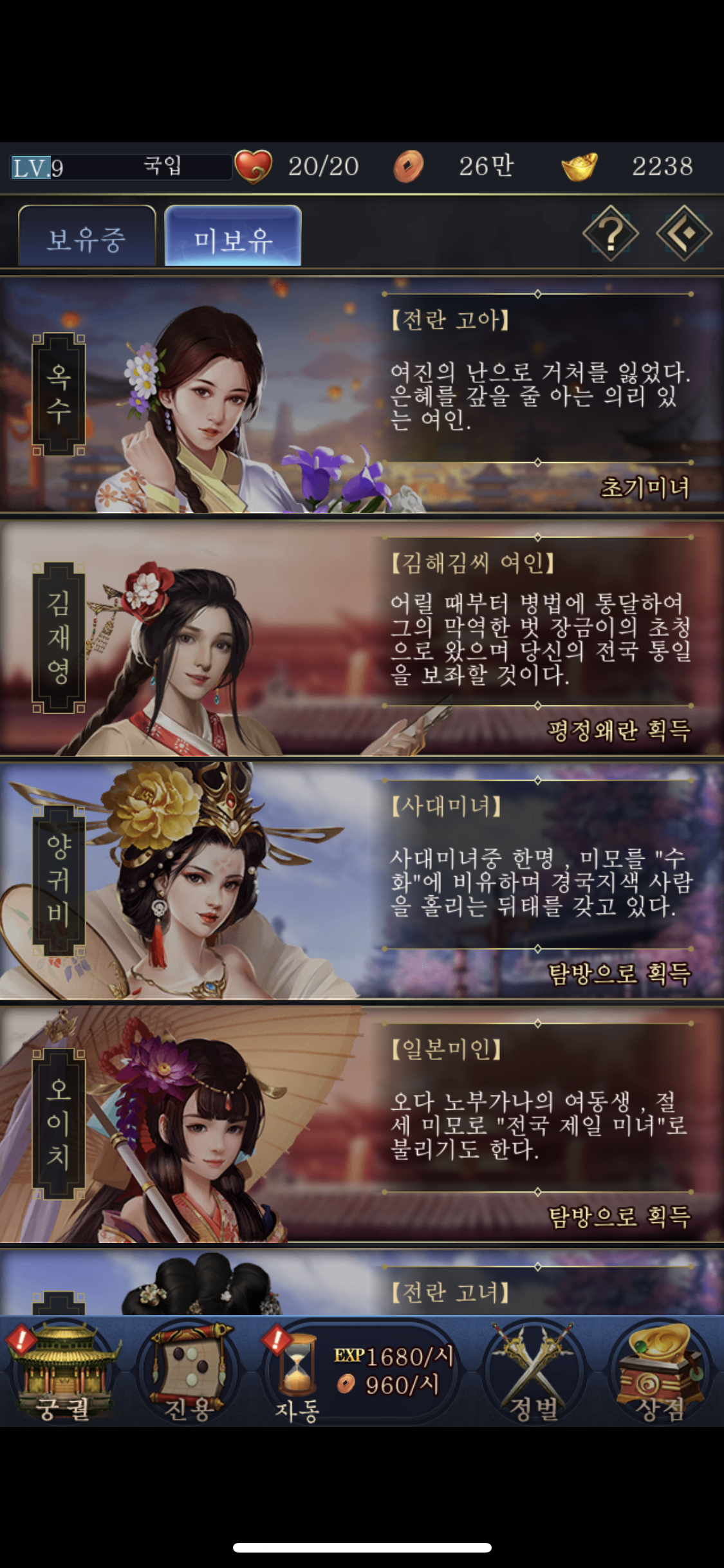 또 이게임에는 특별하게 미인들이 존재를 하는데 여러 경로를 통해서 조각을 수집을해서 후궁으로 들일수가있습니다.