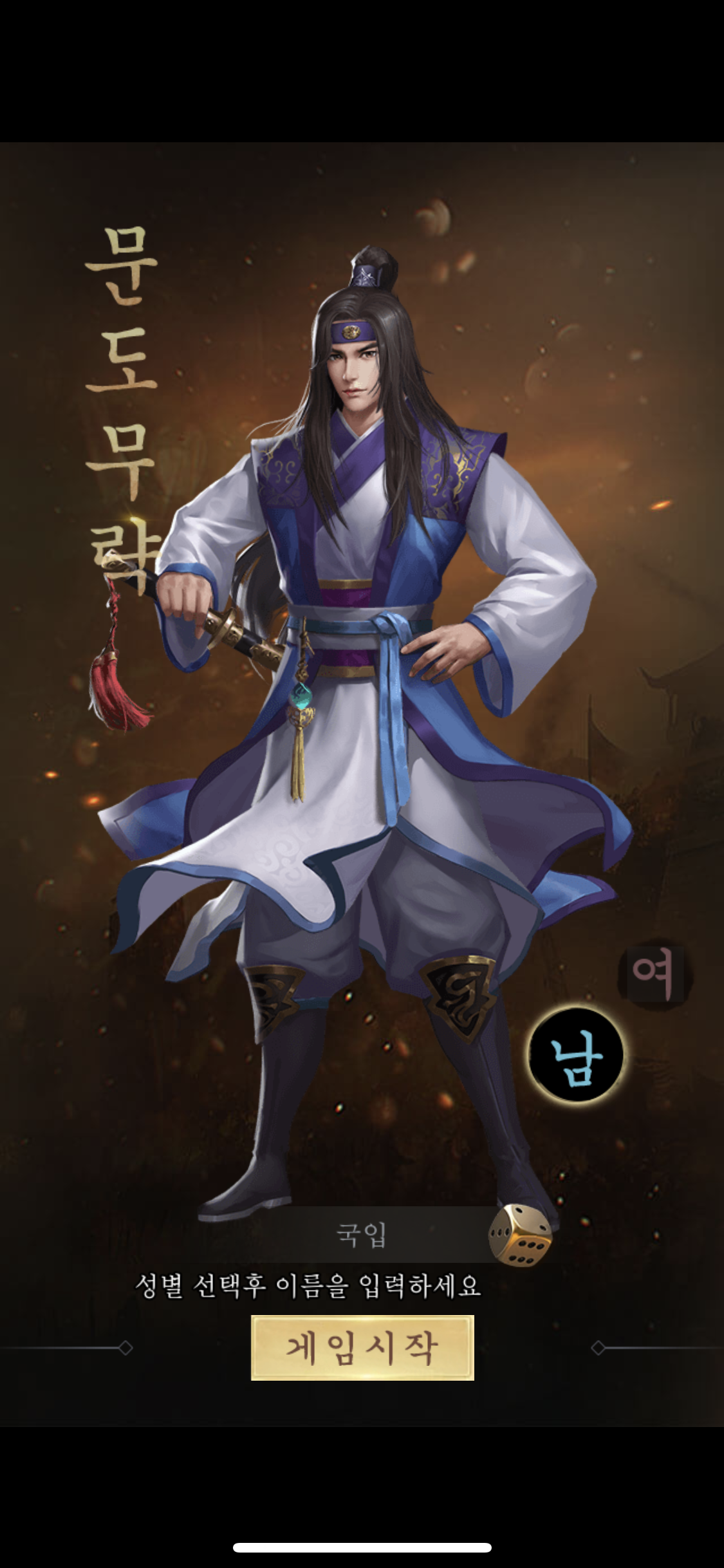 최초에 조선영웅전의 캐릭터는 남여를 선택을 해서 만들수가있습니다. 총대장 즉 주군으로 선택이 가능함.