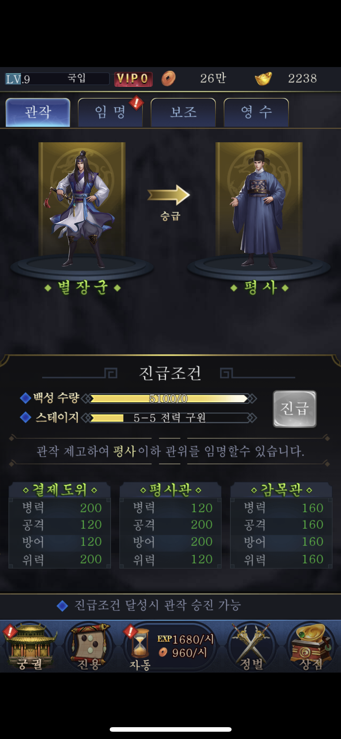 아쉬운건 게임 내 전투씬이 화려하진 않았다는점이지만, 나름 할만한건 굉장히 많았다. 또한 나 군주의 진급 조건을 맞춰서 승급이 가능하며 승급시 나의 장수들에게 관직도 수여가 가능했다.