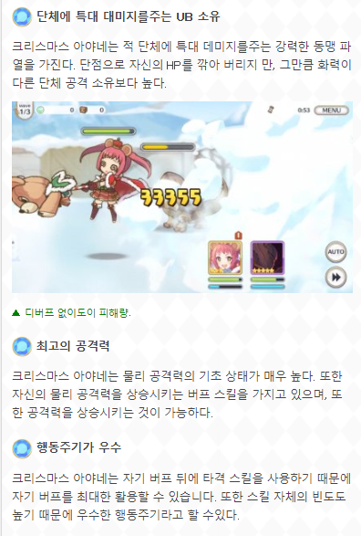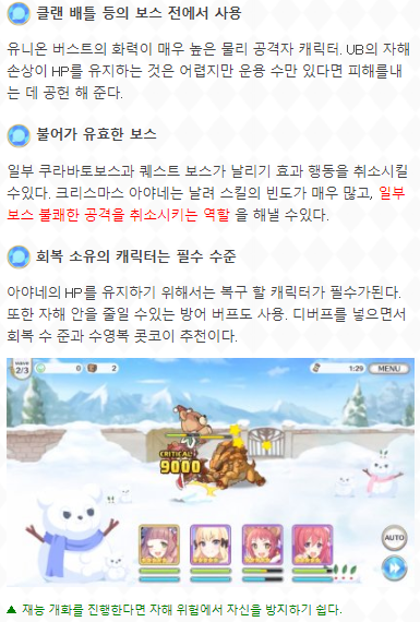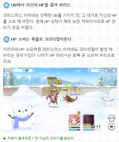 크리스마스 아야네의 장점 단일적에게 높은 데미지를 주는 ub를 보유하고있음. 곰망치로 특대데미지를 줍니다 하지만 자신의 hp를 떨구는게 단점으로 포함이됨. 장단점이 있음.. 물깍없이도 저정도의 데미지가 나왔다고 한다.