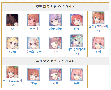 덱구성은 주로 회복력이 가능한 캐릭터들과 또 앞에 든든하게 버텨줄수있는 딜러들과 구성을 시킨다.