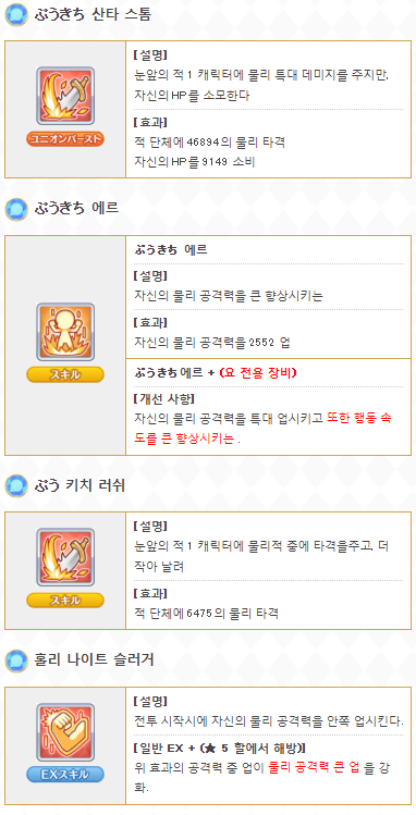 ex스킬 전투시작시 물리공격을 오리며 5성에서 부터는 대의 물공을 증가 시킵니다.