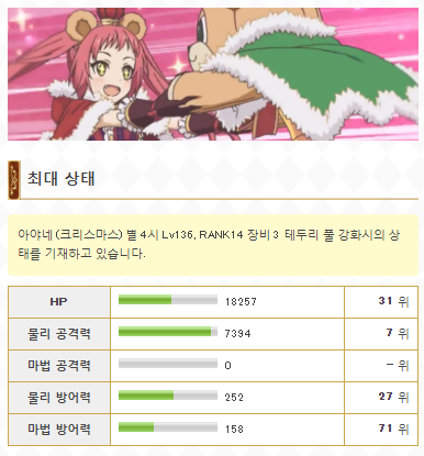 성탄 아야네의 능력치 hp와 물방은 보통 물공이 매우높은 7위 마방은 하위권인 71위입니다.