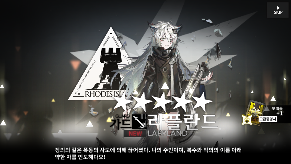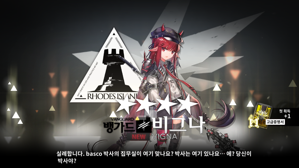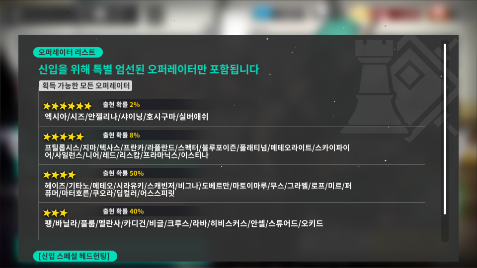 튜토리얼을 모두 끝내면 이제 독점계약 헤드헌팅 가챠를 1회 진행을 한다. 기본 보유 합성옥은 500개가 있는데 380개를 강제로 사용해야한다. 여기서 6성이 나올수도 있다고한다. 나는 4성이 나왔다. 5성은 8% 6성은 2%의 확률이다.