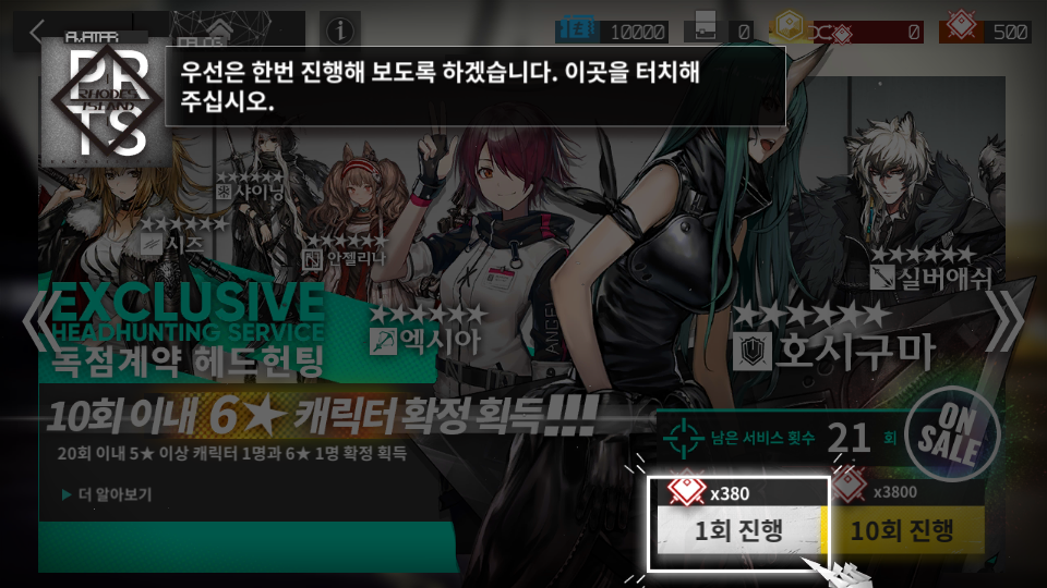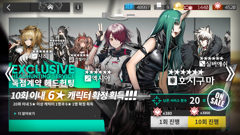 독점계약 헤드헌팅은 총 20가챠가 가능하고 첫회에서는 무조건 6성이 나온다.