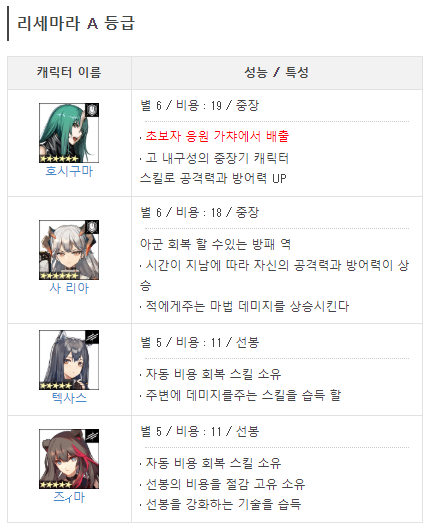 리세마라 S티어에는 4가지 캐릭터가 있다. 초보자 가챠에서는 엑시아 실버애쉬 시즈 3가지를 얻을 수 있다.