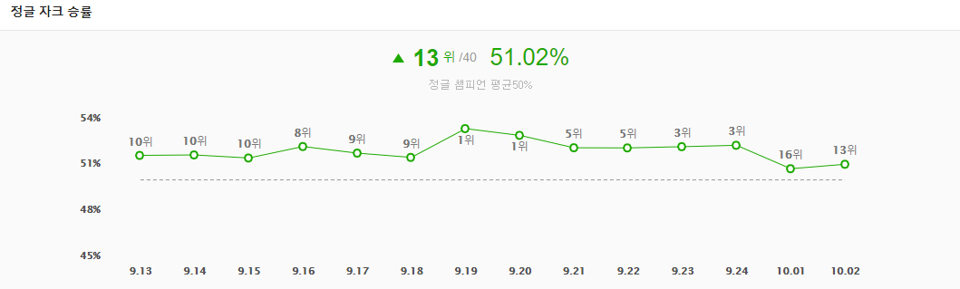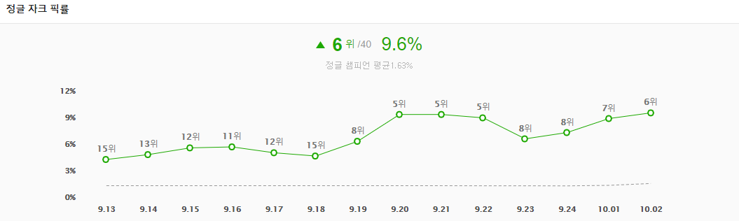 롤 시즌10 자크의 트랜드그래프 입니다. 승률은 평균 13위로 시즌 10이되고 많이 내려왔습니다.