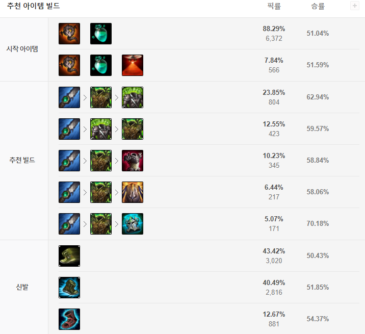 픽률은 6위로 상위권에 속하며 게임 길이별 승률을 볼때 게임이 중후반부에 들어가면서 가장 절정을 맞이합니다.