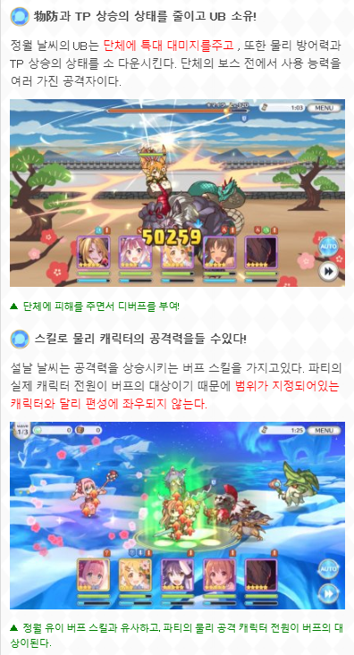 프리코네 신년 히오리의 장점 방깍과 TP를 깍는점도 좋음. 또한 가장 바로 앞의 적에게 특대의 데미지를 줄수있다는점을 장점으로 본다. 또한 물리 덱 중심의 구성시 아군의 데미지를 올려준다는점도 좋다.