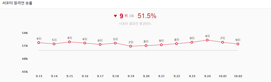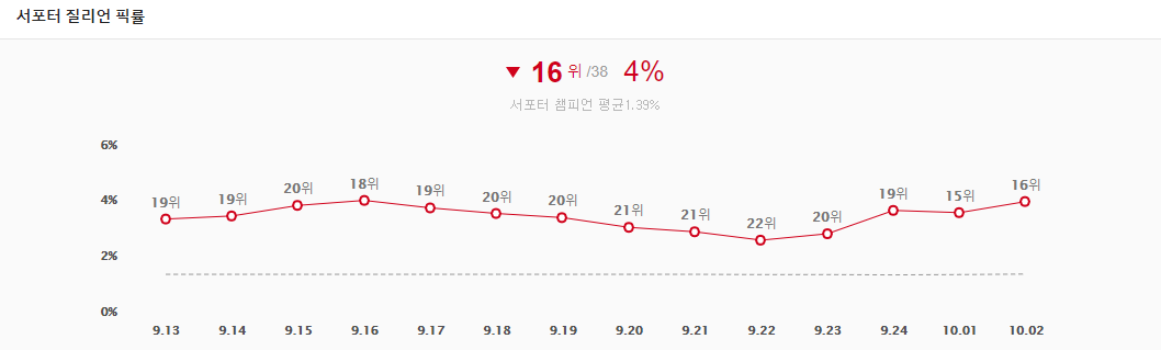 롤 시즌10 질리언의 승률은 서포터중 전체 9위로 상위권에 속합니다. 픽률은 16위로 9.24부터 슬슬 사용이 되고있습니다. 게임길이별로는 준수하고 후반에 크게 내려가는데 이유는 잘모르겠습니다. 현재 서폿 2~3티어를 왔다갔다 거립니다.