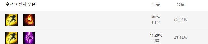 추천소환사 주문은 점멸 점화다 초반에 이득을 보기위해서 정글러가 갱을왔을때 확실하게 킬을 따내기위해서다. Q를 먼저날리지 않고 W를 적중후 아군의 갱킹을 도와준다. 혹시모를경우를 대비해서 점화를통해 확실하게 킬을 내는게 포인트다. 텔포도 나쁘진않다. 텔포가 좋은점은 초반 라인복귀와 후반에 바론 쌈에서 잔나가 혼자 라인을 정리하러 갈때 합류하기 좋은점인데, 초중반이득이 필요한만큼 나는 스펠은 점화가 좋다고 생각한다.