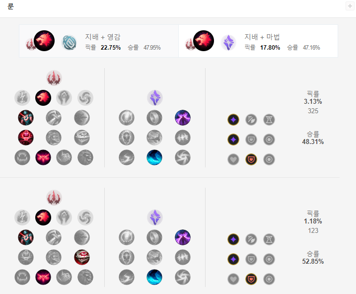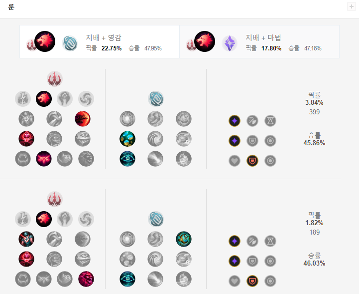 개인적으로는 지배 + 마법을 추천드립니다. 영감으로가면 초시계스타트로 1번 생존에 성공이 가능하고 존야 올라가는 타이밍이 조금 빨라집니다.