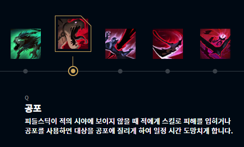 Q스킬 공포는 동일합니다. 투사체를 날려서 체력 비례 피해를 주고 공포효과를 줍니다.