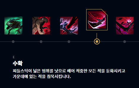 E스킬은 수확 원래는 까마귀 날리기였는데 이게 좀 안좋아진것같습니다. 전방에 피해와 둔화를 주고 가운데 범위의 적은 침묵을 시킵니다. 원래는 콤보로 궁으로 날라가서 앞에있는적을 Q를 쓰고 까마귀를 던지고 존야로 마무리를 했는데 리메이크후 애매해졌습니다. 가운데 맞는 적은 침묵이되는데 특수한경우가 아니라면 똘똘 뭉쳐있는 경우가 적기 때문입니다.