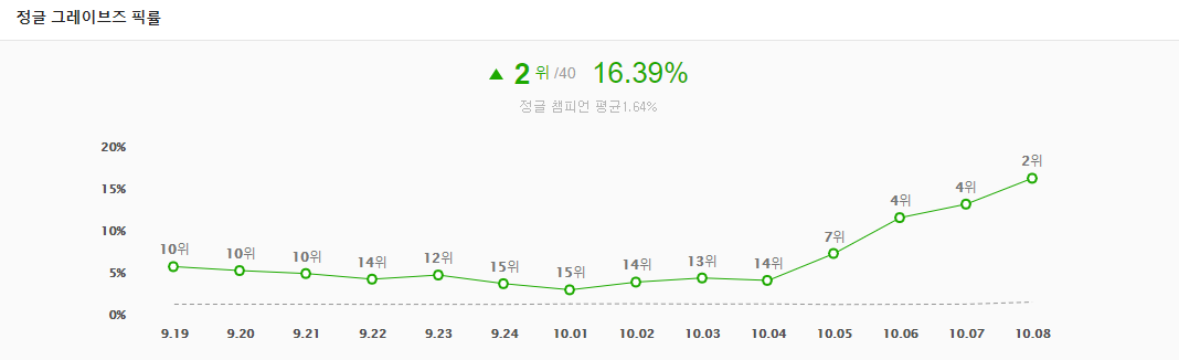 현재 그레이브즈는 1티어 정그로 승률은 40등 중 8위 픽률은 2위를 기록중입니다. 게임 길이별 승률로 볼때도 꽤 준수한 10위권을 유지중입니다. 개인적으로 정글링도 좋고 소규모 교전에서도 좋아서 초중반에 딱히 약점이 있지는 않은것 같습니다.