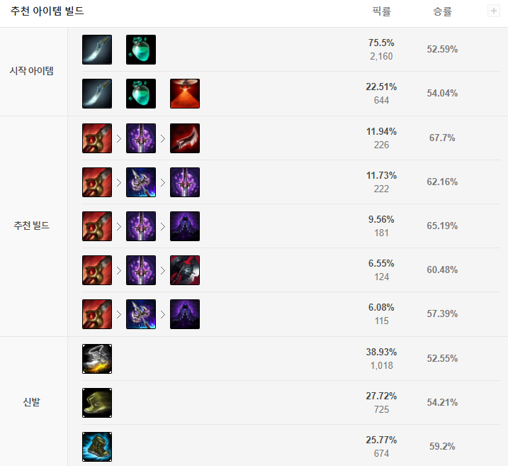 1코어로는 용사를 올리고 그다음부터는 조금은 선택인데 필자의경우는 그림자검을 올리는 편입니다. 장점은 시야를 지울수있는게 많이크다고 생각을해요. 상위티어로 올라갈수록 와드가 정말 많이 박히는데 이를 차단을해서 매복등의 플레이를 쉽게 이어갈수있습니다. 3코어는 드락사나 밤의끝자락 요우무를 셋팅해줍니다. 방관셋팅으로 높은 데미지값을 기대할수있습니다. 신발은 광전사를 많이선호하지만 상황에따라서 닌자의신발이나, 헤르메스를 올려줍니다.