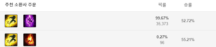 탑으로 사용할때는 점멸과 텔포를 고정적으로 들어줍니다. 칼챔이아닌 탱커로 텔포를 써서 봇이나 소규모 한타에서 활약을 해주는게 좋다고 생각합니다. 킬각을 보기는 어려우나 1:1로 붙었을때 갱호응이 굉장히 쉬운것도 장점. 점화는 그다지 추천을 드리고 싶진 않네요.