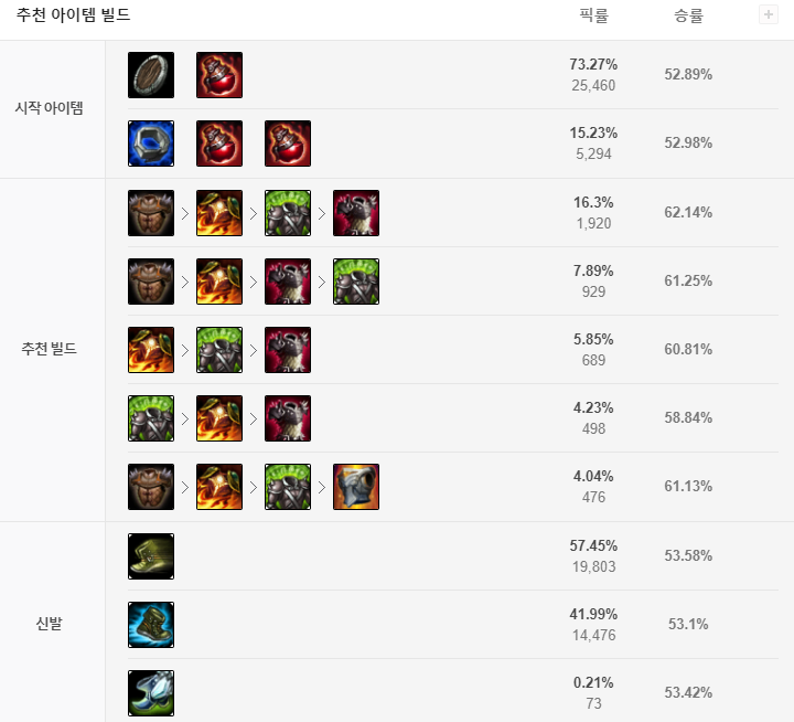 게임 길이별로 보았을때도 극후반을 제외하고는 높은 순위에 들고있죠. 딜러들이 방관템이 나오는 3~4코어 이전에는 정말로 한타에서 큰활약이 가능합니다. 물론 극후반에 다소 승률이 내려가지만, 이니시를 잘걸어주면 밥값은 충분히함.