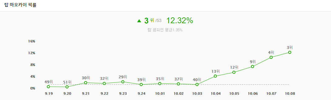 마오카이가 현재 1티어인 이유는 픽률이 꾸준히 늘고 있고 승률또한 굉장히 높기 때문입니다.