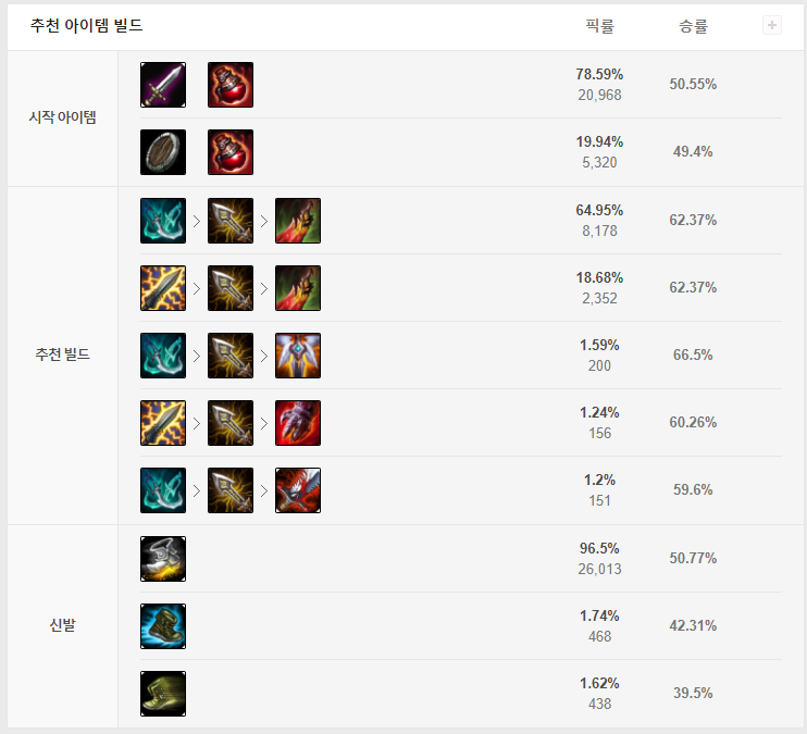 야스오와 템빌드가 비슷하다 패시브로 인해서 치명이 2배가 되기 때문에 50% 셋팅을 하는데, 상대가 ap 누킹 챔프일때는 주문포식자도 좋은 선택이다. 치명 50%를 맞춘후부터는 주로 죽음의무도를 가는게 일반적이나 수호천사나 스태락 등을 구비하기도 한다.