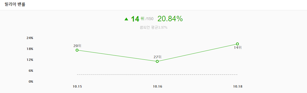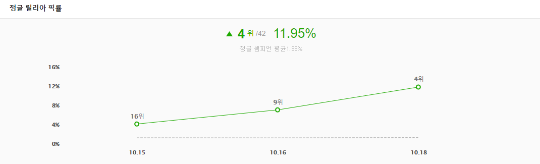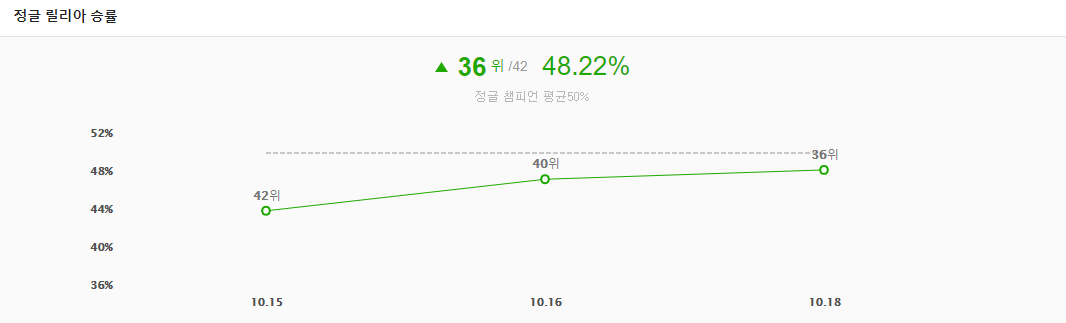 초창기 처참했던 게임 승률은 꽤 복구가되어 48.22%를 기록중이다. 전체 36위인데 정글챔프는 42개가있음. 하위권이라고 볼수가있다.