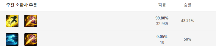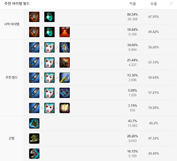 픽률을 꾸준히 상승해 4위를 기록하고 있다. 11.95 꽤 높은 수치다. 어느정도의 버프를 받은것과 drx표식선수의 영향이 있는것 같다.