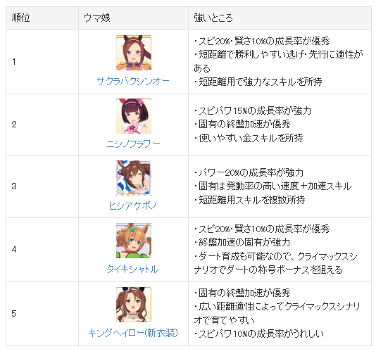 단거리 캐릭터 공통이겠지만 서포트 카드는 스피드2~3, 친구1, 지능2~3로 세팅해주고, 스피드와 파워, 지능 위주로 육성을 해주시면 좋습니다. 그 외에도 킹 헤일로, 하루 우라라도 순위에는 포함되지 않았지만 단거리 육성에서 상당히 쉬우니 참고