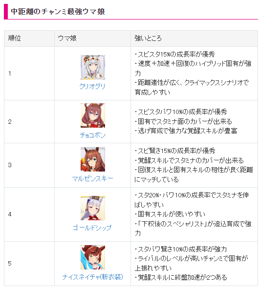 중거리에서는 추후 나올 크리 오그리 캡이 1위로 뽑혔습니다. 현재 한섭에서는 마르젠스키와 골드쉽 밖에 출시가 되지 않은 상황입니다. 중거리는 육성이 쉽지는 않습니다. 스피드 / 스태미너 / 파워를 고르게 올리고 지능을 추가적으로 올려주는 것을 추천합니다.(주로 스피드를 올리면서 같이 올라가는 파워정도도 충분함.)