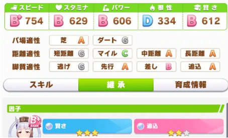 높은 별의 인자는 육성중의 캐릭터에게 총 3번 계승을 받는다.(육성 시작, 2년차 4월 전, 3년차 4월 전) 첫 번째 계승 이후에는 인자 성급에 비례해 랜덤한 보너스를 준다. 초반 주로 스피드를 트레이닝에서 많이 올리기 때문에 단거리와 마일의 경우는 파워, 중거리와 장거리는 스테미나의 스텟을 많이 받기 위해서 인자작을 진행하는 것이다.