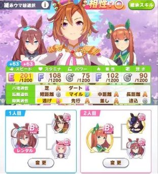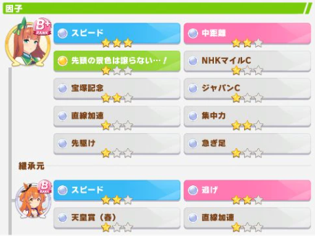 위의 캐릭터를 보면 스피드로 1,2번 부모로부터 모두 63을 획득한 것을 볼 수 있다. 부모와 조부모말 총 3마리가 모두 파란 인자 스피드가 3성이기 때문이다. 우리는 해당 사진처럼 만들기 위해서 현재 캐릭터에서 원하는 스탯 3성을 달성하고 또 다른 캐릭터 3성을 만든 뒤 조부모로 만들고 또하나의 캐릭터를 3성작을 진행하면 된다. 대여가 하루 5회 제한이기 때문에 만약 스테미나 63,63을 만든다면 총 6회의 3성 스테미나 인자작을 진행해야 한다.(청색인자를 우선으로 하고, 후에 적색도 같이 진행한다.)