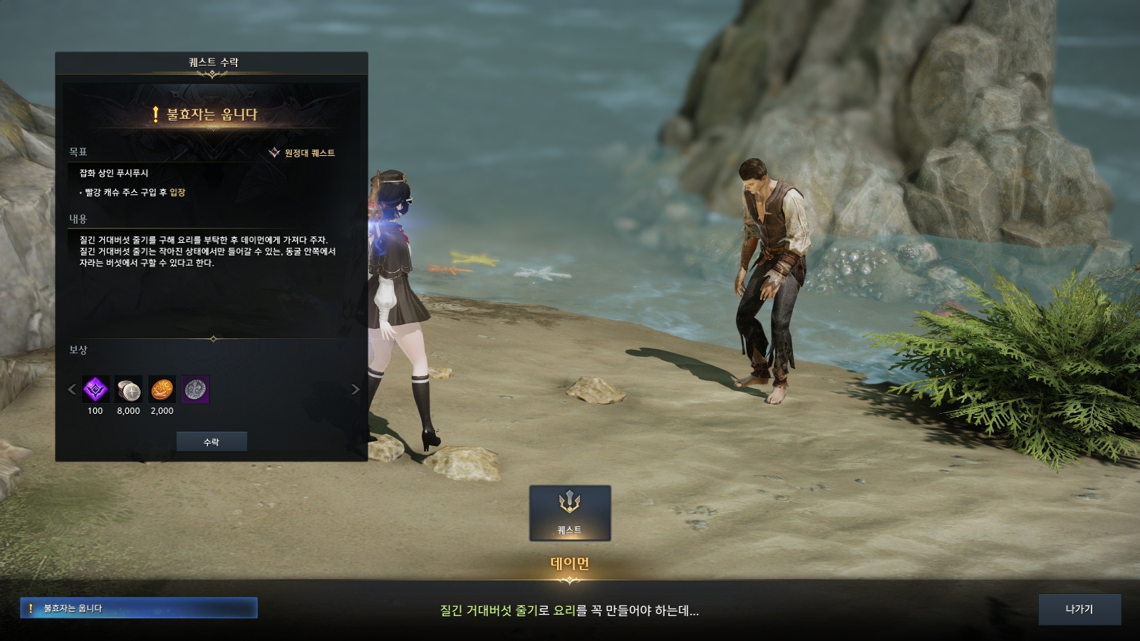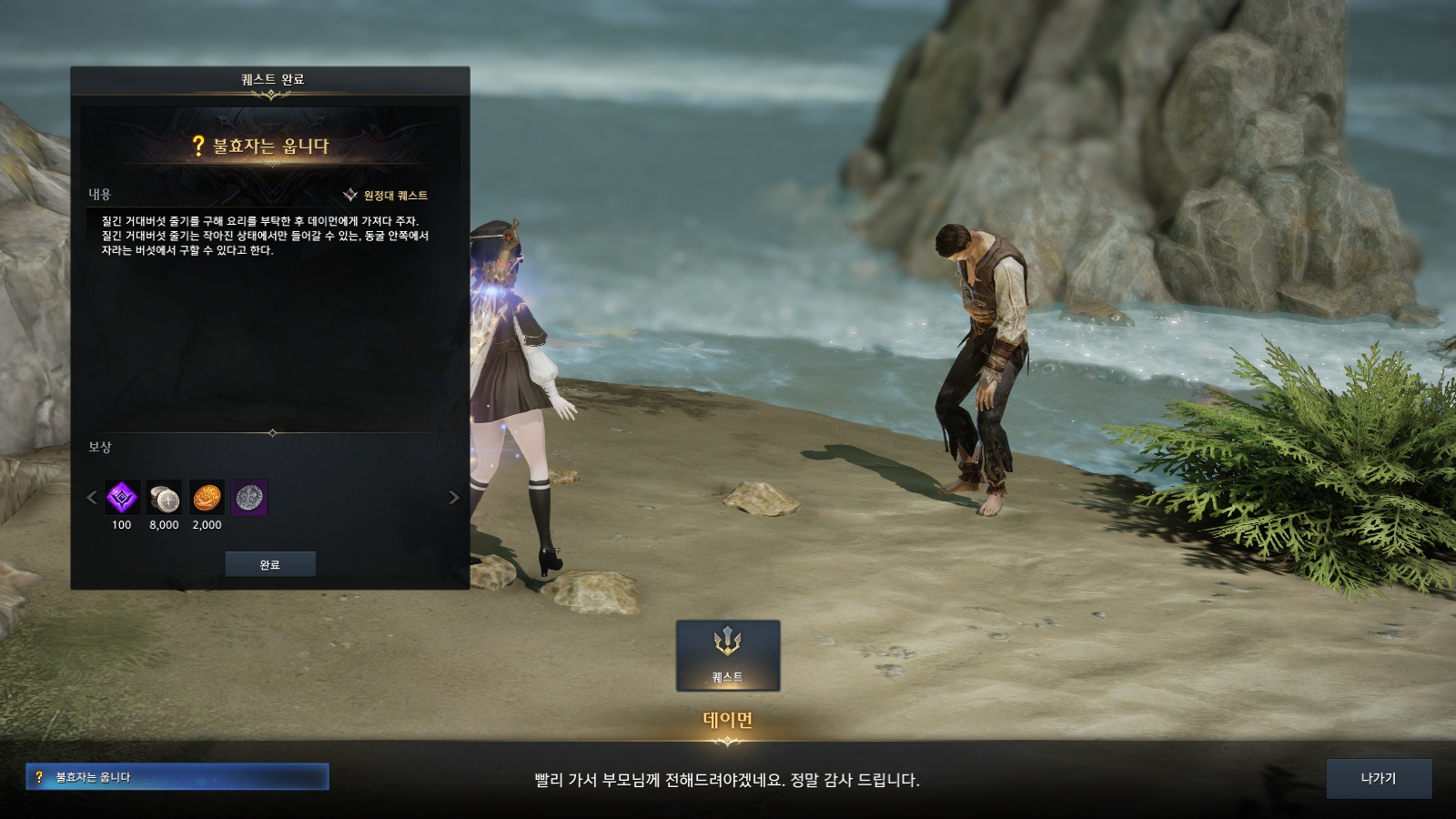 버섯(나무) 5~7그루를 벌목하면 질긴 거대버섯 줄기 100개를 획득할 수 있고 섬밖으로 나와 퀘스트 '불효자는 웁니다'를 완료하면 원정대 경험치를 비롯해 실링, 해적 주화, 고대의 백금화를 획득할 수 있습니다. 난이도가 어렵지 않아 초반 섬의 마음 20개 보상인 '상급 스킬 포인트 물약'을 목적으로 한다면 적극 추천합니다.