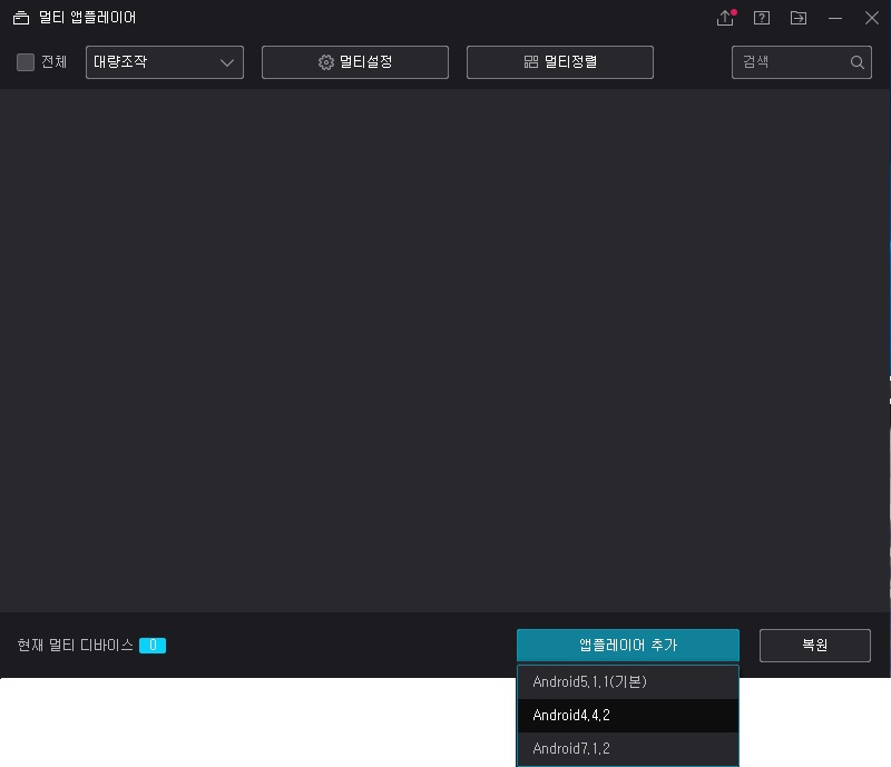 멀티를 할수있는 화면이 나오며 아래에 앱플레이어 추가를 통해서 4.4.2를 눌러주면 한개가 생성이 됩니다.