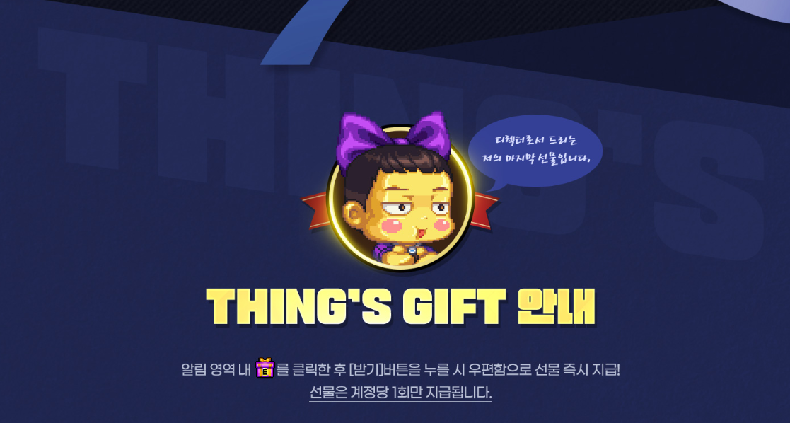 던전앤파이터 인 게임 접속 후 알림 영역 내 E 아이콘을 클릭 후 받기 버튼을 누르면 우편함으로 선물이 즉시 지급됩니다. 선물은 계정당 1회 지급됩니다.
