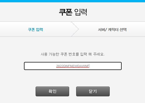 던파 페이지에서 2022DNFNEWDAWNF 쿠폰을 입력합니다.