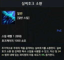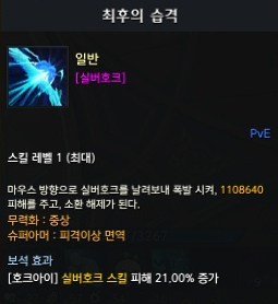 실버호크 게이지를 가득 채워 실버호크를 소환 뒤 최후의 습격을 날려 적중된 대상이 자신에게 받는 피해를 8초간 증가시키는 효과가 있습니다. 8초간 사이클을 돌려 딜을 넣는 메커니즘을 가지고 있답니다.